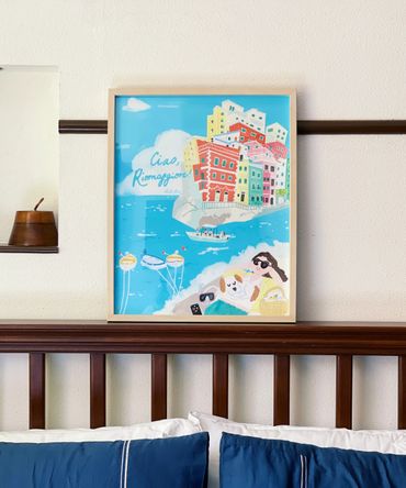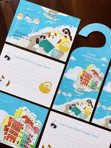 Let's get away! To the beautiful Italian town of Riomaggiore with the ocean breeze and vibrant architecture. This illustration is accompanied by a series of hotel branding mock-ups.