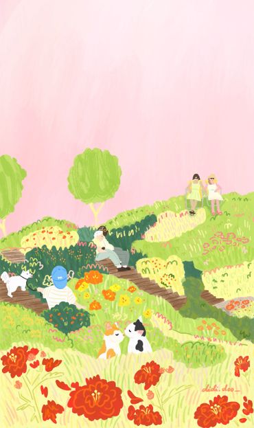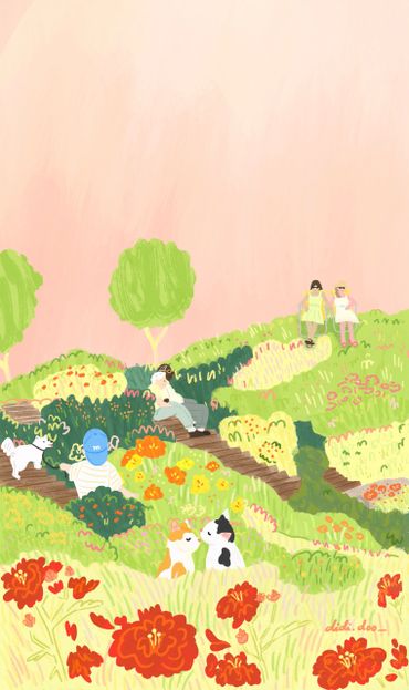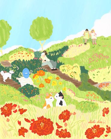 A garden illustration inspired by a friend's picture taken in California and Utada Hikaru's song of the same title. A piece celebrating love and the happiness that comes with it. Formatted into wedding invites for a new challenge.